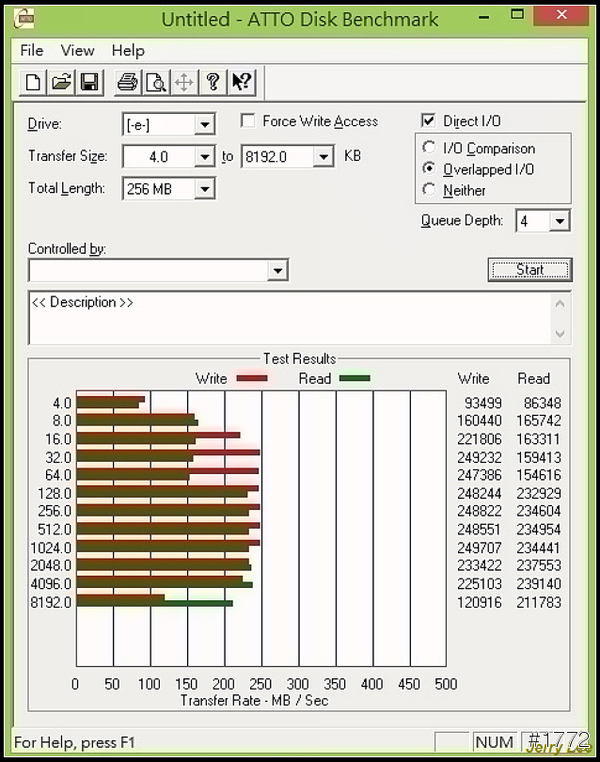▲ATTO Disk Benchmark在 Overlapped I/O (重疊輸出/入)模式,QD4 4K的表現讀取86348 寫入93499