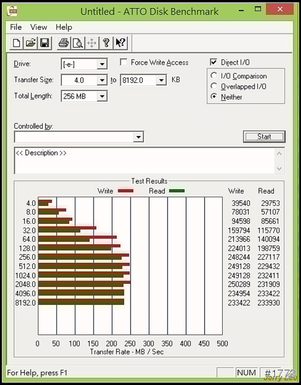 ▲ATTO Disk Benchmark在Neither(兩者皆非)模式,QD4 4K的表現讀取29753 寫入39540