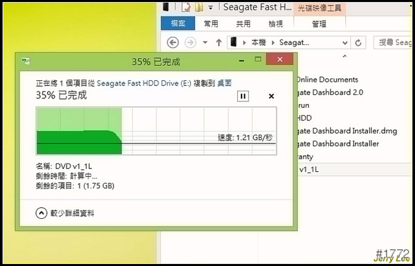 ▲反過來從Seagate Backup Plus Fast 拖拉映像檔到桌面,可以看到讀取速度初期2GB/s以上慢慢下降