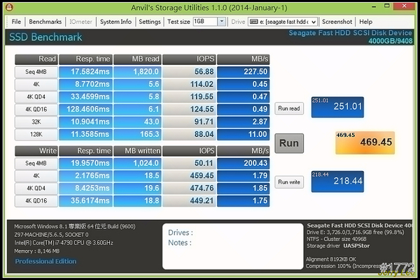 ▲Anvil's Storage Utilities Seq 4MB 存取速度為讀取 227.60MB/s、寫入200.43MB/s
