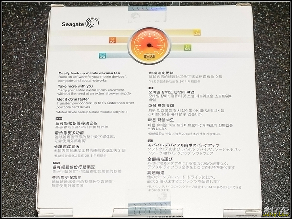 ▲在外盒側邊最大可以到達220MB/s的傳輸,比一般傳統的硬碟速度還快,並且支援跨平台作業,不管是微軟或是蘋果都可以用