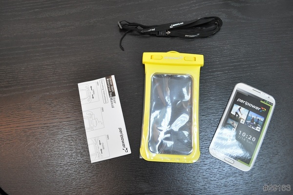打開包裝,內附東西其實就很簡單,防水袋本體X1、應該是吊繩X1、象徵可以放進跟SAMSUNG NOTE 2大小一樣的一張卡X1、使用說明書X1。