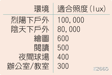 各種環境的照度值範例: