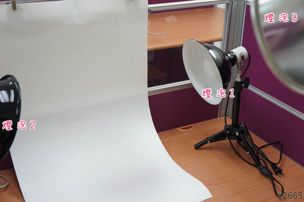 首先,我們把周圍的所燈光都關掉,架好三顆燈泡,投射出來的燈光,左、右、前各一盞燈泡。