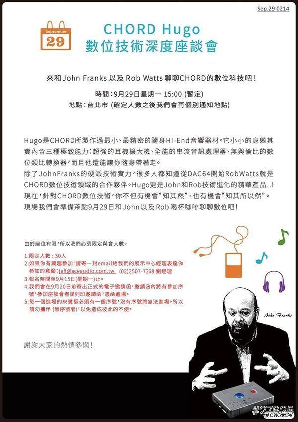 2.如果你有興趣參加,請寄一封email給我們的展示中心經理表達你參加的意願:jeff@aceaudio.com.tw 劉經理 (02)2507-7268