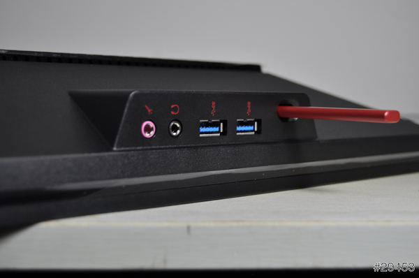 顯示器的介面,底部是各種視頻界面,側面是兩個usb3.0,紅色突出的是掛耳機的一個小東西,可以收回去
