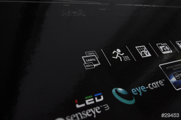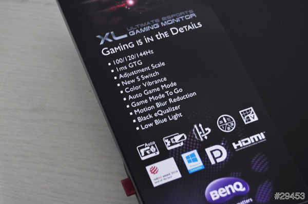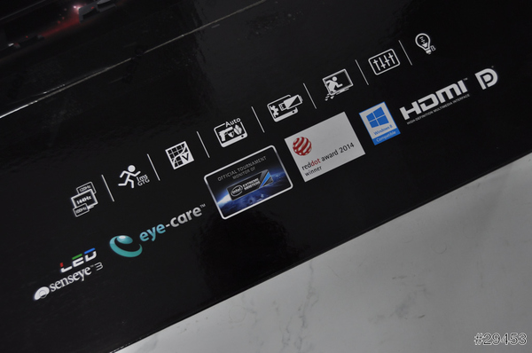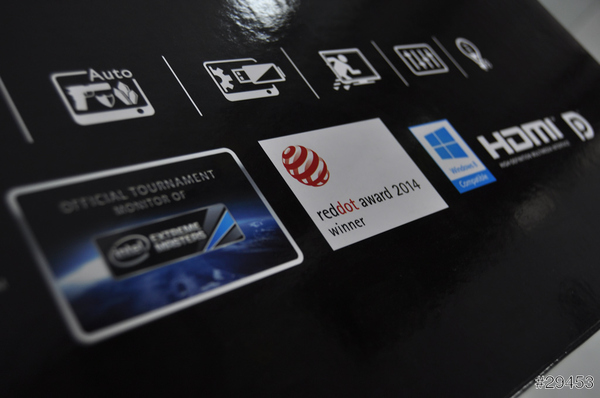 盒子上的N多標示,下邊的一行主要是支持的一些東西,LED背光、HDMI介面、DP介面什麼的,貌似還獲得了一個紅點獎的獎項。上邊一行是顯示器的一些技術了。