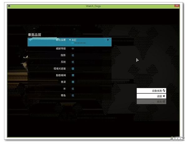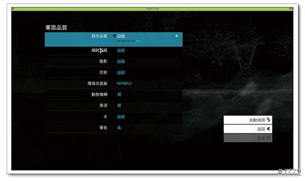 ▲畫面品質開到超級試試(不知道我的舊顯卡跑不跑得動),在環境光遮蔽部分看門狗裡面分為 HBAO+ High、HBAO+ Low、MHBAO 與 off 四種設定,不同於傳統的陰影, 環境光遮蔽可以導致光的遮蔽,進而創建出非一致性的陰影,如此可增加場景的深度,設定的高低會影響陰影的真實感