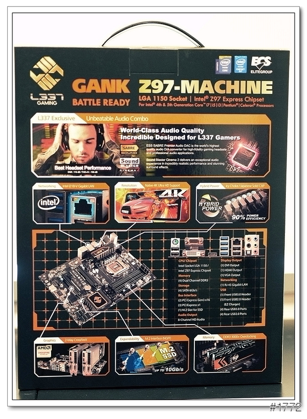 ▲外盒的背面介紹了,玩家需要的影音效果(支援4k解析度播放、Sound Blaster Cinema 2 聲歷其境的音效、穩定的Intel網路晶片、支援雙顯卡、還有最新的M.2 SSD)