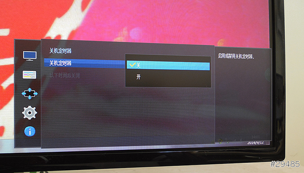 在OSD菜单里有关机定时器这项,选择开就能定时关机啦