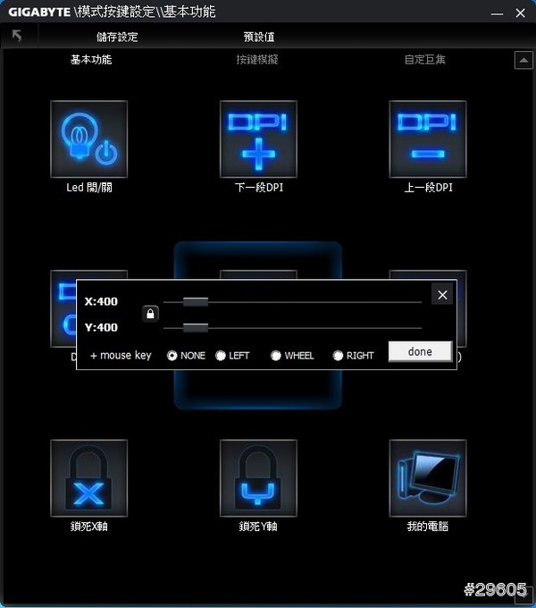 ↑有一特別的是有DPI鎖定功能,可以選擇按壓跟切換兩種,這讓我突發奇想,意思說可以在滑鼠上設定兩組狙擊熱鍵,低速的以按壓模式可以慢慢瞄,在設一組中慢速的快速切換,或可以說細調跟粗調吧!!