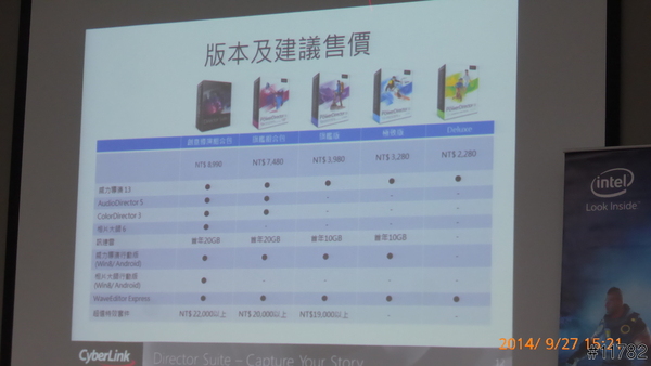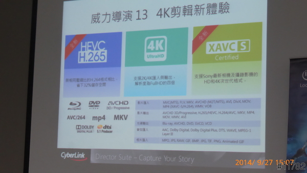 訊連最出名的Director不但獲獎無數, 還海內外出名. 目前已經出到第13版, 支援最新的4K/H265/XAVCS. H265提供比H264更棒的壓縮, 可減少高達32%空間. XAVCS是SONY主打的4K規格, 年底資訊月若真的買RX100M3, 那就可用Director來處理. 還支援Intel AVX2, 提供3X快的rendering, 比競爭對手快上數倍! Director有各種不同組合, 讓user可選最適合自己的. 真希望也能弄到1套最高檔的Director來玩玩; FYR, 果然T客邦沒讓我失望, 下次再來分享該活動.