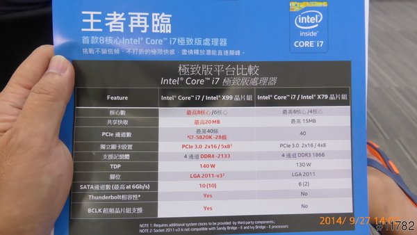 X99平台是採用Intel最新的8核心flagship CPU: Haswell-E core i7. 不但和最新的Thunderbolt 2相容, 還能支援高達64GB的DDR4, 這可讓4K轉2K的速度提高69% [和4核心相比]. 而且可讓你同時使用4片獨顯, 還有最多40條的PCle 3 + 最多6組USB3的I/O.