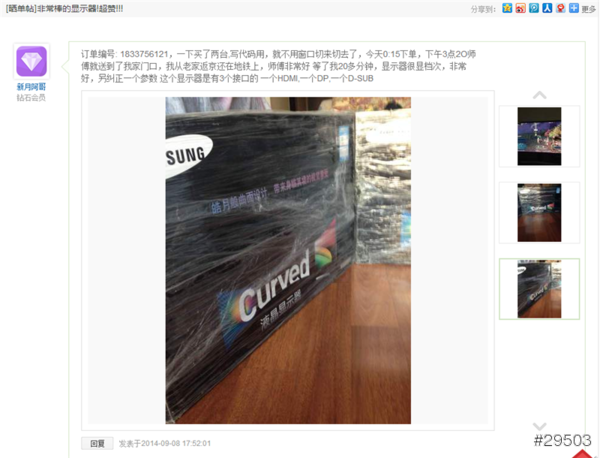 曲面显示器一听就很吸引人,购买前看看大家的看法还是很重要滴。看中的是三星曲面SD590C,现在在京东中已经有卖的了,价格才不到3000元。 外观+价格。看看大家的评价吧,我感觉还是不错的。 看电影弧度设计效果还不错,SD590C的支架感觉也很美呀~ SD590C的外包装,这位的评价也说显示器不错。 总体来说使用过的人对这款显示器的评价还是挺好的,我也准备入手了,使用后再和大家分享实际感受吧 讚 收藏 快速回應 引言回應