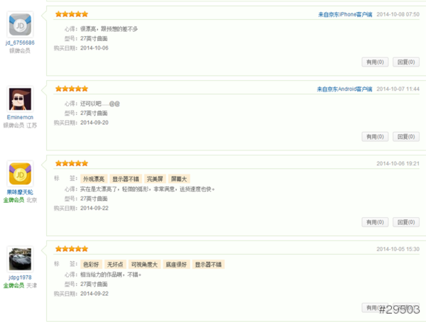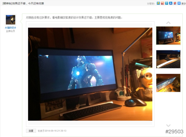购买前的搜集,三星曲面SD590C京东晒单合集,这款到底如何? 生活 · 花孙阿米米 · 發表於 2014-10-10 14:19 · · 檢舉 列印版 twitter plurk 3.3千閱讀次數 曲面显示器一听就很吸引人,购买前看看大家的看法还是很重要滴。看中的是三星曲面SD590C,现在在京东中已经有卖的了,价格才不到3000元。 外观+价格。看看大家的评价吧,我感觉还是不错的。 看电影弧度设计效果还不错,SD590C的支架感觉也很美呀~ SD590C的外包装,这位的评价也说显示器不错。 总体来说使用过的人对这款显示器的评价还是挺好的,我也准备入手了,使用后再和大家分享实际感受吧 讚 收藏 快速回應 引言回應 登入來回應 header home