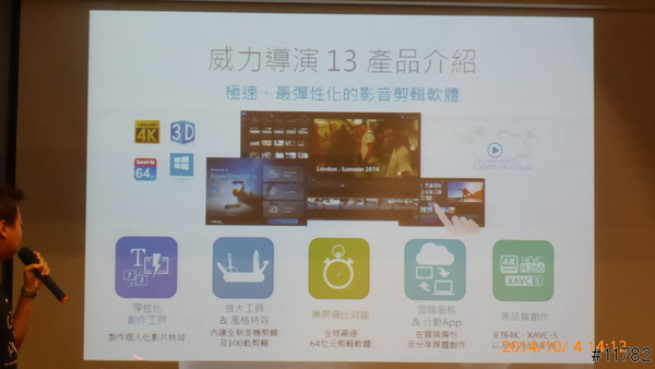 再來我跑去聽主角, PowerDirector. PM介紹V13的很多新剪輯模式, 各種字幕, fade in/out..., 還能利用聲音來做智能判斷, 自動幫你找到不同步的live cam而變同步[可處理高達100台], 這樣你就可做完美無縫的剪接.