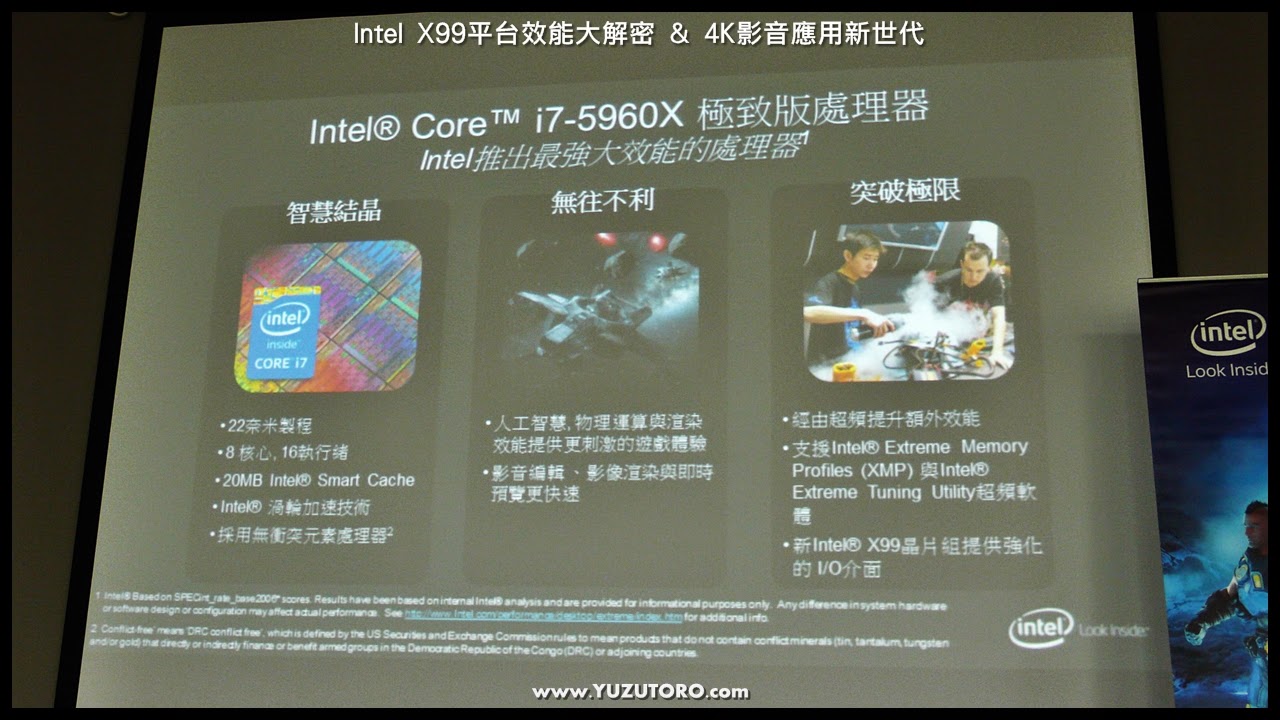 Intel 最新的 8核心頂級 X99平台的專業效能,訴求客群主要是使用專業軟體,效能要求高的專業工作者,與享受極致聲光,硬派遊戲玩家,這次辦的體驗會主要為前者也是以主打高清 4K影片來測試。
