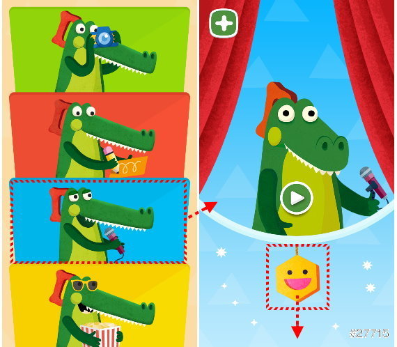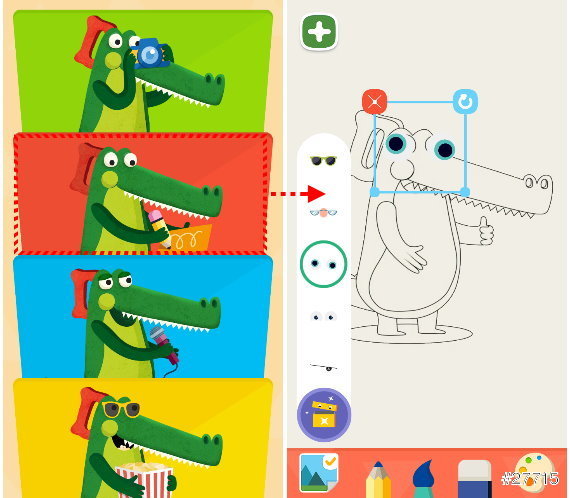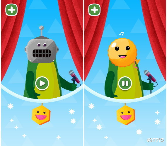 這可以錄音小朋友說話和唱歌,下方的六角笑臉往下拉,可以換機器人、大熊、氣球人每換一個聲音就會不同,同樣的錄音內容,但有不同的聲音,非常逗趣。