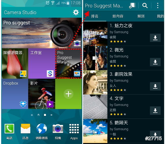 Galaxy K zoom專業建議裡預設的模式有: 「復古風格」、「檸檬黃」、「歌德黑白風格」和「鮮豔色彩」,也能從專業建議裡下載其他的拍照風格。