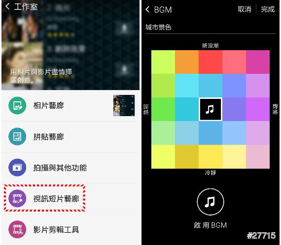 視訊短片藝廊可以選擇15張圖片製作成一段影片,還可以從預設的音樂裡搭配成配樂。