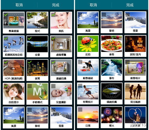 這11種拍照模式是預設的,如果要拍嬰兒、食物、日落、煙火…等模式,可以到「管理模式」裡勾選我們要新增的拍照模式。