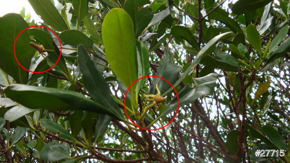 「水筆仔」每年的5月結花苞;6-7月時開花,花為白色;6-7月開花結果後成圓錐狀,艾倫來的時間是10月,這時候的水筆仔正是圓錐狀;要等到明年的2-4月間筆狀果實成熟變成紅褐色落地面。
