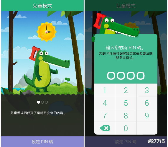 進入兒童模式,先設定一組PIN碼,當要離開兒童模式時需要輸入這組PIN碼才能回到一般模式。