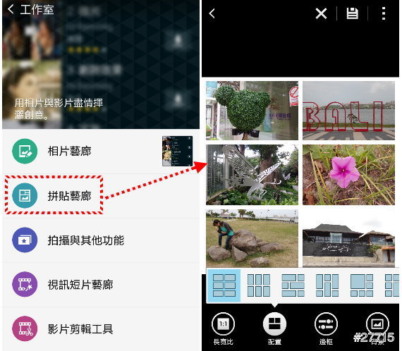 拼貼藝廊可以選擇6張照片,有不同的配置可以將照片組合起來,也可以更換背景佈置。
