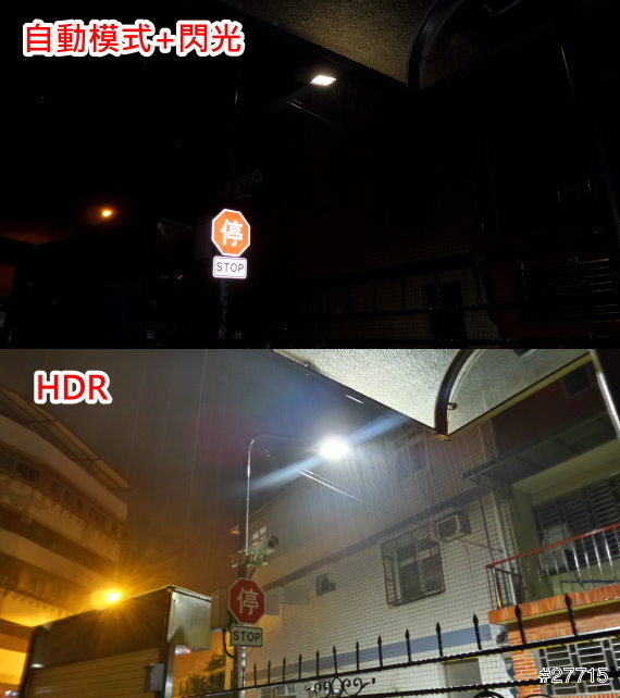 拍攝的場景是一個下雨的夜晚。用自動模式和HDR做對比。