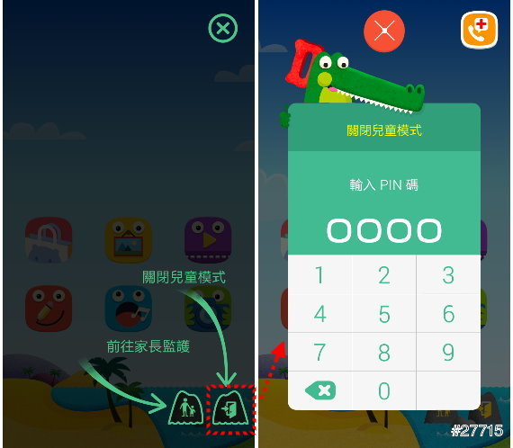 按「離開兒童模式」時,要輸入一開始設定的PIN碼,就能離開兒童模式。