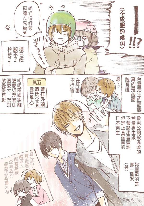 原來在櫻花妹眼中...台灣男這麼有魅力阿~~~看完都想交個櫻花妹女友了 XDD 作者作品網站:http://goo.gl/FXs41U 1 個人說讚 收藏 快速回應 引言回應 共 2 則回應 1 樓 · 翡璃月 · 發表於 2014-10-14 18:18 · 檢舉 原來是這個樣子,學起來了 讚 引言回應 2 樓 · 安然 · 發表於 2014-10-16 16:21 · 檢舉 對不起,此篇回應已被標記為垃圾,內容只有管理員可見。 讚