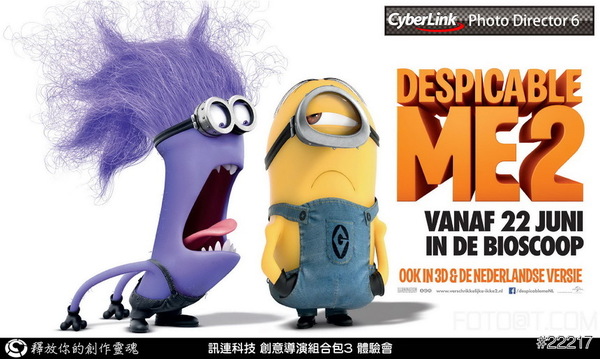 ▲使用Photo Director6中的塑身工具,位置在"編輯"中的"人物美化工具"裡面,可以對圖片做隨意的變形,就以這張神偷奶爸的小小兵海報來試用,這張照片有點是紫色的邪惡小小兵想要嚇黃色的小小兵,由於黃色小小兵比較小,我想讓他變大一點,所以在塑身工具中先使用筆刷調整適當大小,將紫色小小兵及右方文字部分先選取出來做為被保護的部分,然後就可以使用向前變形、按壓、膨脹及復原來任意變形圖面,這些功能也都可以選擇區域的大小與強度,調整好了之後,黃色小小兵已經變得又高大,有點不削的眼神,好像根本不怕紫色小小兵的樣子。在此一提,使用這個工具建議圖面要修改區域中不要有容易讓人參考的線條出現,尤其是直線及建築物,在變形時會很難處理,容易看起來很假,像背景很單純或是風景、草地的修改就比較容易。