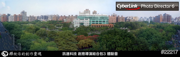 ▲在Photo Director6的編輯選單中可以使用全景相片的編輯,我一次將15張附近公園的局部照片輸入到軟體中,在合併之後會得倒一個很大張的全景相片,以這15張,每張都4M多的檔案集合之後,合併的照片有27M多,而且在合併的過程中圖片的邊緣總是會有空白的部分,這種狀況也可以考慮開啟"自動填滿邊界"的功能,軟體會自動運算做四周局部的變形;要特別注意一次放入太多張照片電腦可是會運算很久的,這15張照片可是花了我超過半小時的時間,我製作的影片有經過快轉,不然看的人可能真的會睡著吧。