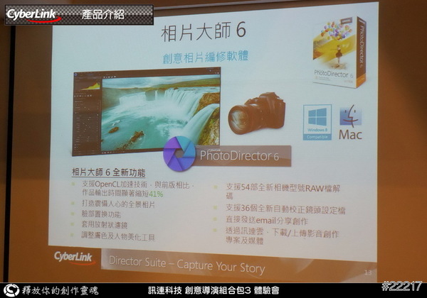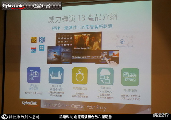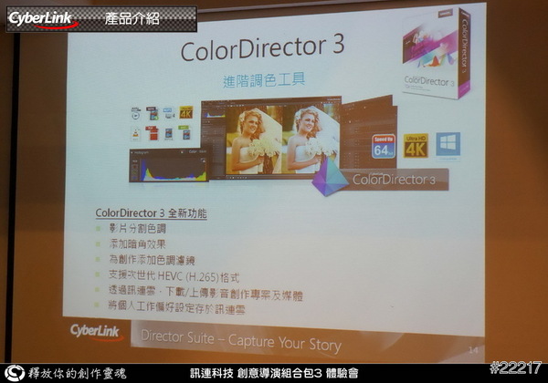 ▲國內的影音編輯軟體大廠CyberLink訊連科技又要舉辦體驗會了,距離上次今年6月初在COMPUTEX辦的體驗會來看,只相隔4個月,訊連又推出了新的產品,以往訊連的主力產品威力導演經過4個月的修改後已經變成了13版,在內容上到底新增了哪一些部分呢?這次的主力產品是威力導演其件組合包,內含威力導演、Color Director及Audio Director,其實應該算是從威力導演走出來而散出來的軟體,一方面避免單一軟體的體積太大,另一方面也是各個軟體的成熟度提高了,所以功能都增強,而且能相互合作,以達到最好的效果;在加上相片大師的加持,訊連在這方面真的算是翹楚了。