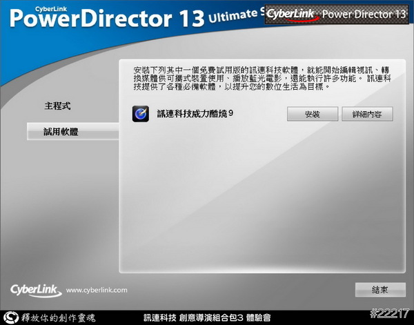 ▲Power Director13的安裝主畫面中試用軟體-威力酷燒9。