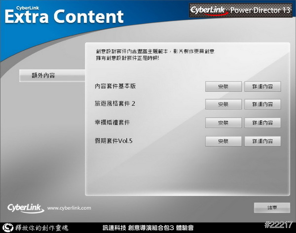 ▲Power Director13內附的4組套件,分別是內容套件基本版、旅遊風格套件2、幸福婚禮套件與假期套件5,可以讓影片的編輯更豐富有更容易。