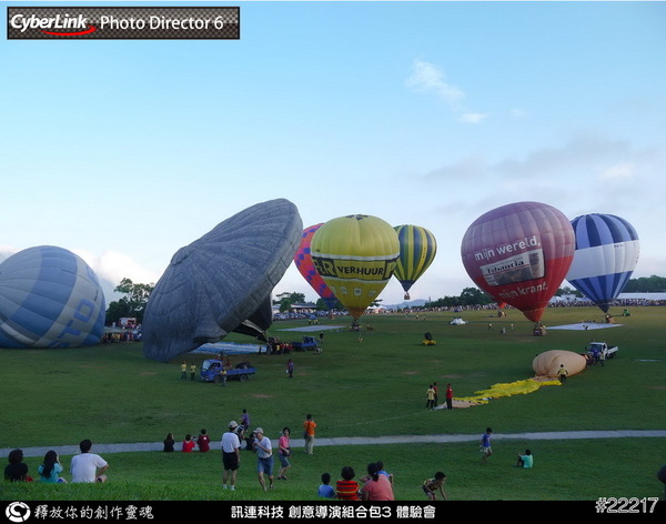▲Photo Director6中的"調整"選單中,選擇"風格檔",裡面有很多已經設定好的各種風格的模式可以套用,如果不夠的話更可以連上Director Zone上網下載更多的網友分享風格檔的設計;假定這樣的需求還是不夠,就可以在左側選單中按下"手動"的選單,裡面有多種可以細部調整的功能鍵,以這張去年的台東熱氣球照片來試用,因為熱氣球都是一大早或是傍晚才會升空,除非運氣好或者是相機配備很好,不然在光線不足的狀況下,照片所出來的顏色不是偏暗就是飽和度不夠,因為這張照片主要是以水平衡像的構圖,所以我使用了方形的漸層遮色片,首先先設定第一個遮色片在下方死氣沉沉的草坪恢復一些色彩,然後加了另一個遮色片在上方增加天空的藍色調,最後在中央的熱氣球區域加了最後一個遮色片加強亮度,出來的照片就跟原本的照片差滿多的,而且這一些設定都是可以隨意修改,要改成粉紅色的天空與橘色的草坪也是可以的。
