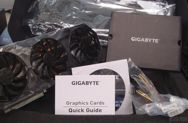 ↑包裝盒內容物,霸氣的GTX-980、大4Pin轉PCIE電源線*2、說明書、光碟。