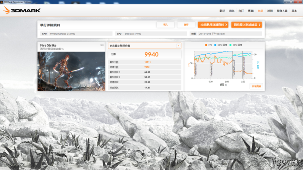 ↑跑一下3DMARK分數是9940,平台是i7-490、RAM 24G,主版忘了是哪一個了。