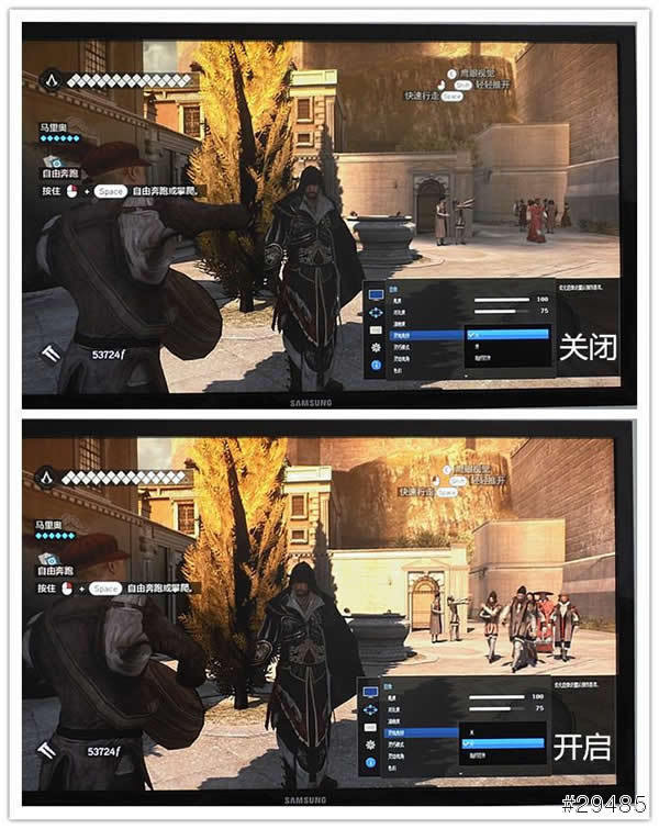 开启灵视竞技以后整体亮度增强,暗部细节看的更清楚,立体感出来了,灵视竞技还有防拖影的效果,游戏起来就更方便了,长时间玩游戏可以选择始终打开,非常喜欢这个功能。关关键是我的显示器比较给力,想买4K的可以考虑~