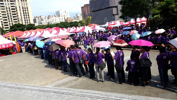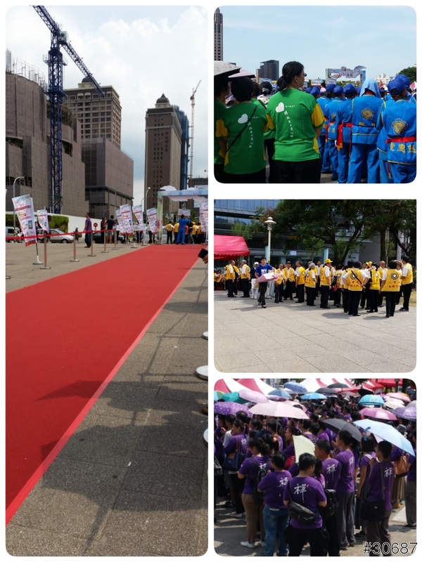 現場真的是蠻猛的一遍紫。。。嘉年華的攤位也都被這些紫衣人淹沒,被擠爆,這個紫衣團體就是前段時間因藝人江淑娜被妙禪加持結果在瘋狂抖動事件在各大新聞媒體爆紅的妙禪如來宗,現場妙禪法師的信徒初估兩三千位以上人潮不斷湧入,整條馬路都看的見他們的身影!每位信徒們頂著大太陽手呈拜拜姿勢不斷重複師父午安、師母午安,頗大聲團結,特別的是沒有宣傳單也沒有一直推銷叫人買東西,不至於讓人感到反感不舒服,反倒是利用攤位佈置牆面來介紹他們的傳教的意涵。
