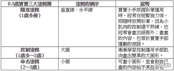 因此,在孩子的塗鴉期,家長並不需要刻意規定寶寶畫多久,或一定要畫些什麼內容;其實這也是寶寶遊戲的一種方式,更是寶寶學習控制身心的重要發展歷程喔!
