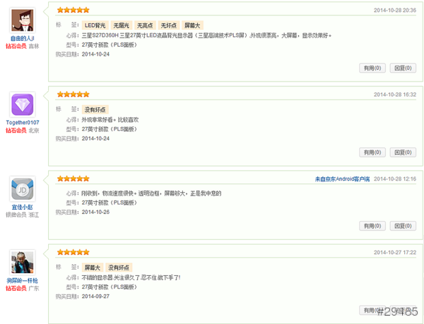 三星S27D360H这款显示器有568条评价,93%都是好评,上面我截了一部分评价都是对悦彩很满意:外观好、显示效果好,没有坏点等,哈哈看来我眼光不错,对了还有晒单