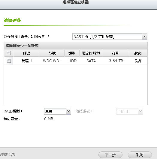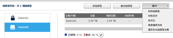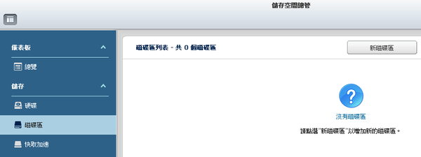 ▲在新硬碟插入的狀態下,點選QTS桌面上的儲存空間總管,進入硬碟設定後新增磁碟區。