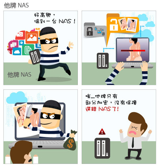 從上面的漫畫來看,如果磁區是加密狀態,那就算整台NAS被偷走,也無法取得內部資料,不過在經過上面的使用過程後,自己有點好奇,如果磁區是未加密狀態,那NAS被偷走或被入侵,資料是不是就會被取出呢?