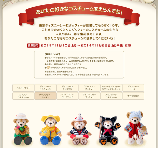 Duffy 小熊的魅力無限,相信很多女生朋友們都人手一隻吧?不過,限量總是殘酷的,每年推出的限定版本,總是被掃購一空,下手太慢的只能悲歎QQ 好消息來了!今年歡慶 Duffy 十週年,宣布了會重新販售三款限定款!!從11/10到11/28號,網友們可以在東京迪士尼官網上投票,最高票的前三名會重新販售,明年就可以買的到了! 操自然通通都想要阿~~~~ 讚 收藏 快速回應 引言回應