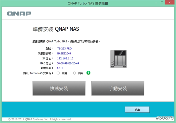 ↑到QNAP官網下載Qfinder,就可以找到QNAP NAS並出現這個安裝精靈畫面。