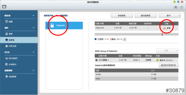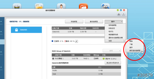 ↑如果要上鎖,在「動作」選擇「加密→鎖定當前磁碟區」,然後NAS內的資料就無法被任何人存取了!