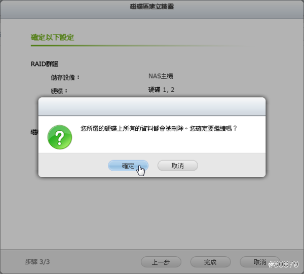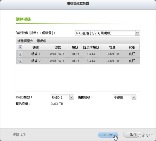 ↑在「磁碟區建立精靈」步驟1/3中選擇2顆硬碟及RAID 1類型,如果選擇JBOD或RAID 0的話,雖然磁碟區的空間多了一倍,但是就必需承受日後硬碟有壞軌、檔案救不回來的風險。