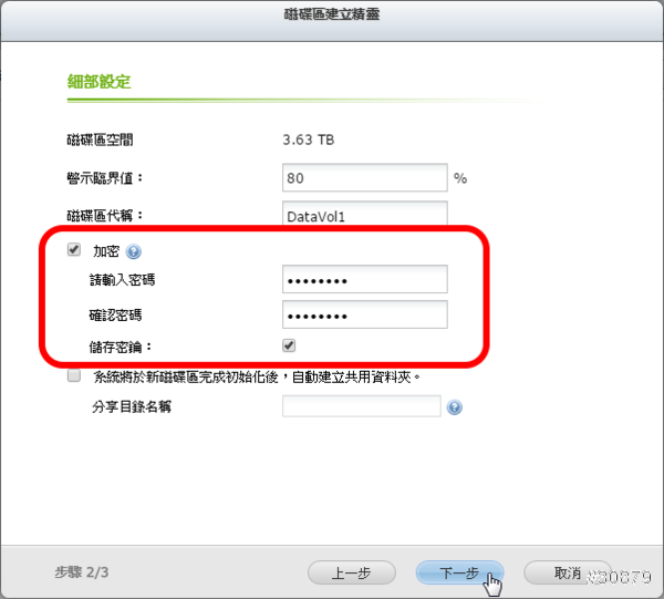 ↑在步驟2/3選取「加密」並輸入密碼,順便勾選「儲存密鑰」這樣NAS才會維持「解鎖」的狀態,才能存取裡面的資料。